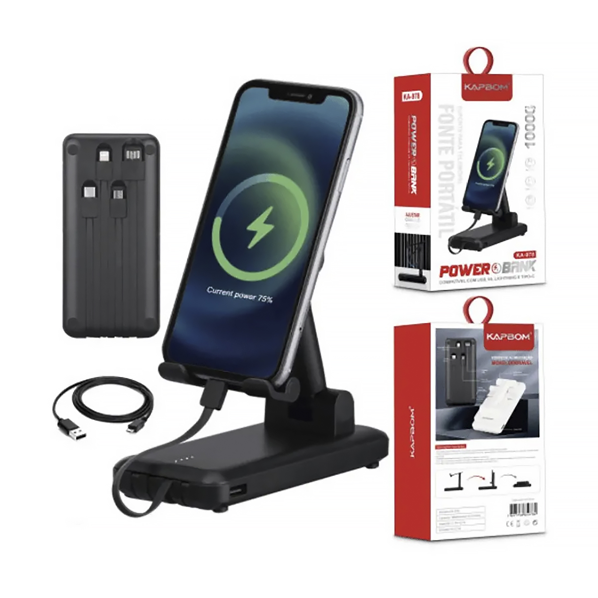 Power Bank e suporte de mesa acoplado, para carregamento porta via porta USB, Tipo C, Micro USB e Lightining.